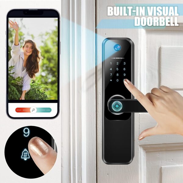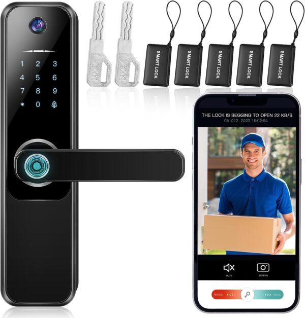 - Cerradura de puerta con cámara: la cerradura de entrada sin llave con aplicación combina una cámara avanzada 1080P, recibe alertas de notificación cuando alguien toca tu timbre o activa tu sensor de movimiento integrado; siempre puedes saber quién está en la puerta; ten en cuenta que la función de desbloqueo remoto es pasiva presionando el timbre en la cerradura activada, la cámara no tiene capacidades de videollamadas o grabación