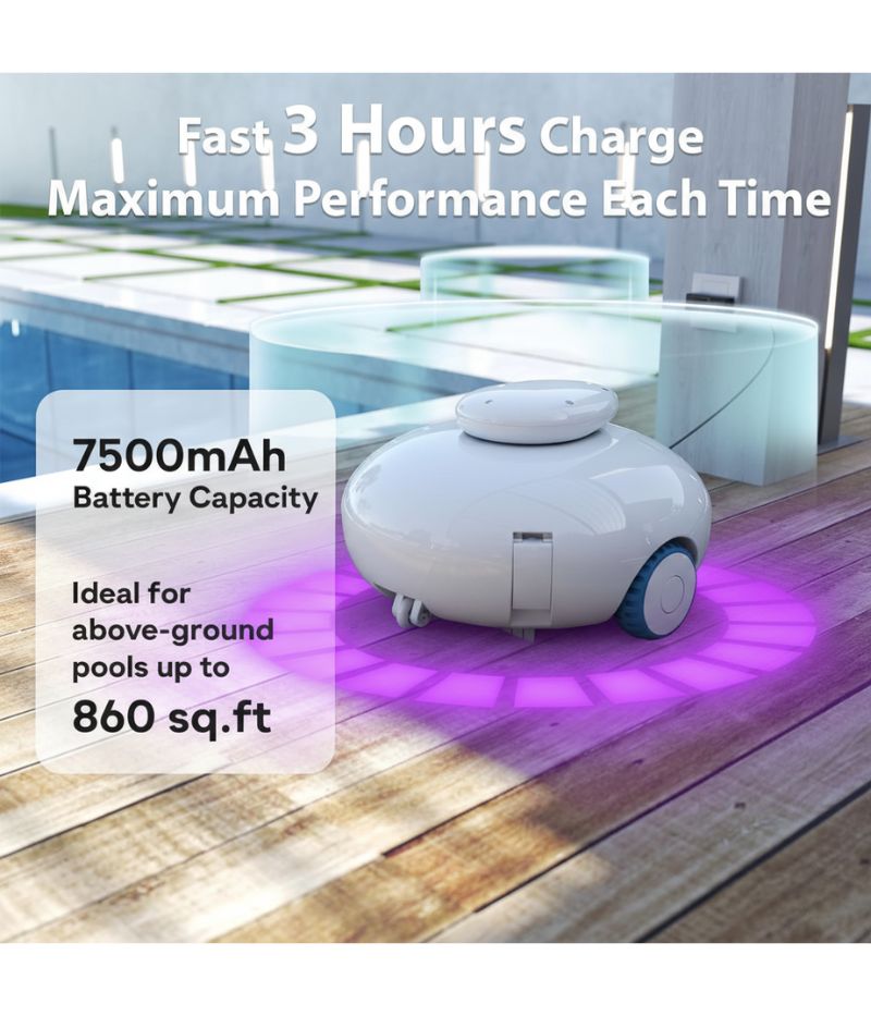 El aspirador robótico inalámbrico para piscinas está equipado con motores duales de alta eficiencia que proporcionan una fuerte succión (hasta 20 Gpm/85L/min) para una limpieza profunda de hojas y residuos.
