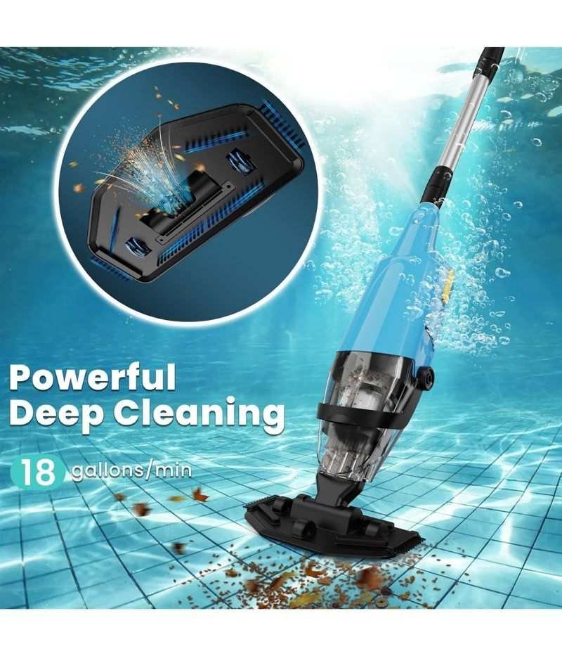 Esta aspiradora de piscina de mano inalámbrica ofrece una potente succión gracias a su motor de 8 galones/minuto, ideal para limpiar a fondo spas, jacuzzis y piscinas pequeñas, capturando desde arena hasta piedras pequeñas.