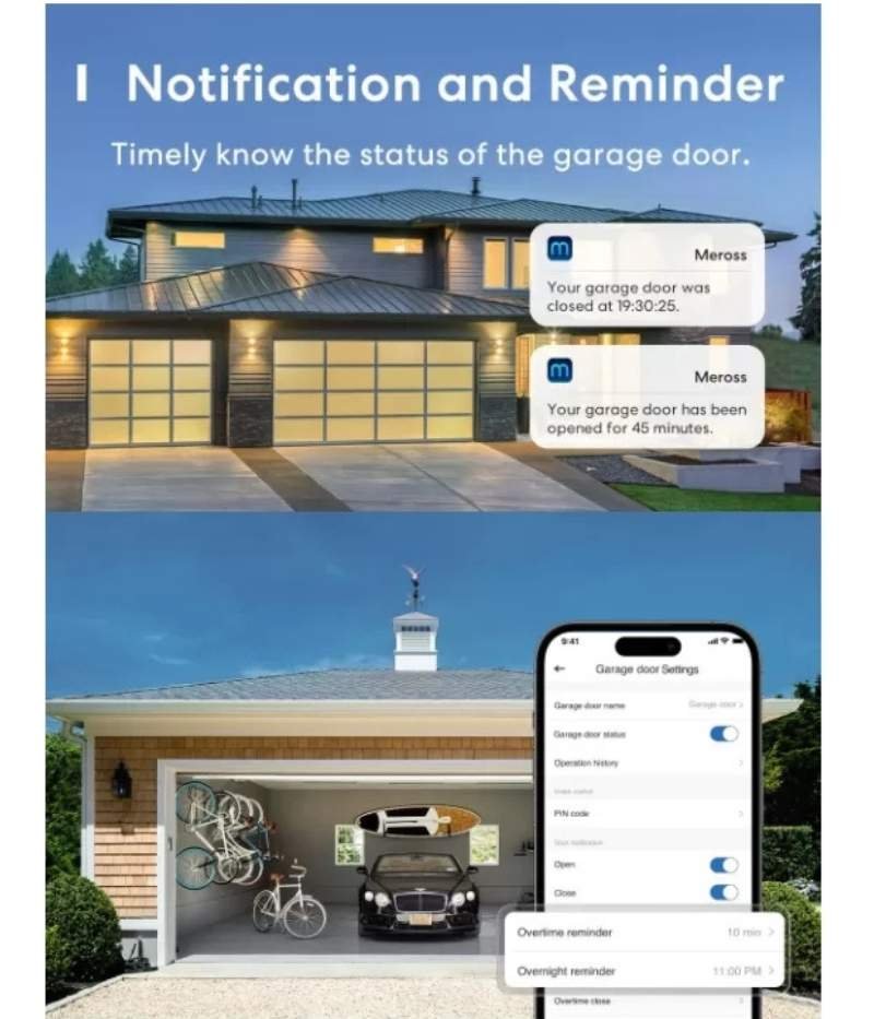 - Acceso Remoto y Voz: Controla la puerta desde cualquier lugar mediante la app (solo WiFi 2.4 GHz) o usando comandos de voz con Apple HomeKit, Alexa, Google Assistant y CarPlay.Monitoreo Preciso: Incluye un sensor de alta sensibilidad para conocer el estado exacto de la puerta. Recibes notificaciones de seguridad si la puerta queda abierta demasiado tiempo o durante la noche.
