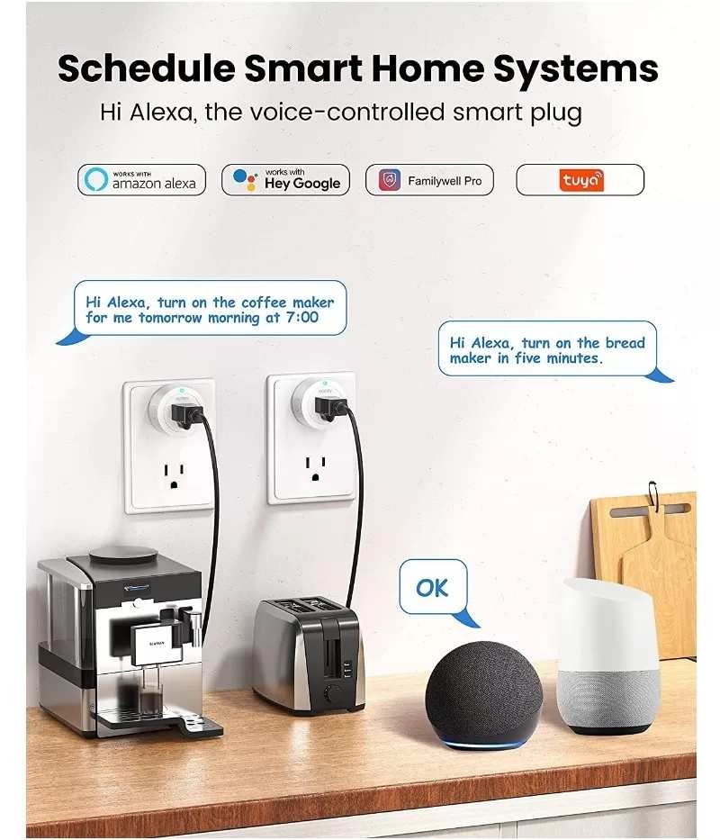 • Control de voz: el enchufe inteligente es compatible con Echo y Google Home. Al emitir comandos de voz a Alexa o Google Assistant, controla tus electrodomésticos a través del enchufe doméstico inteligente. Control con  Alexa/Google Assistant: Haz clic en la aplicación «Me » en » Familywell Pro «. Base en tu altavoz inteligente para elegir «Alexa» o «Google Assistant». Sigue los pasos de unión uno por uno, puedes añadir control de voz a tu enchufe inteligente.