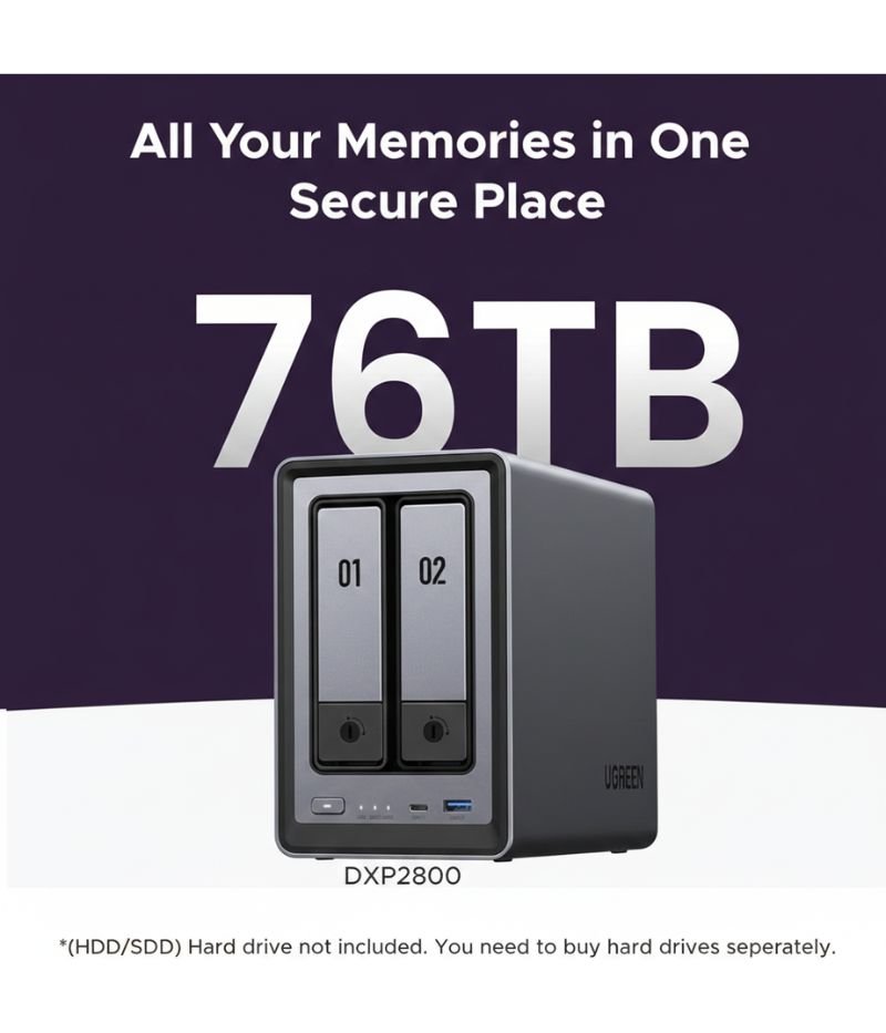 Almacenamiento Masivo: Ofrece una capacidad de hasta 76 TB para copias de seguridad de fotos, videos y archivos generales.