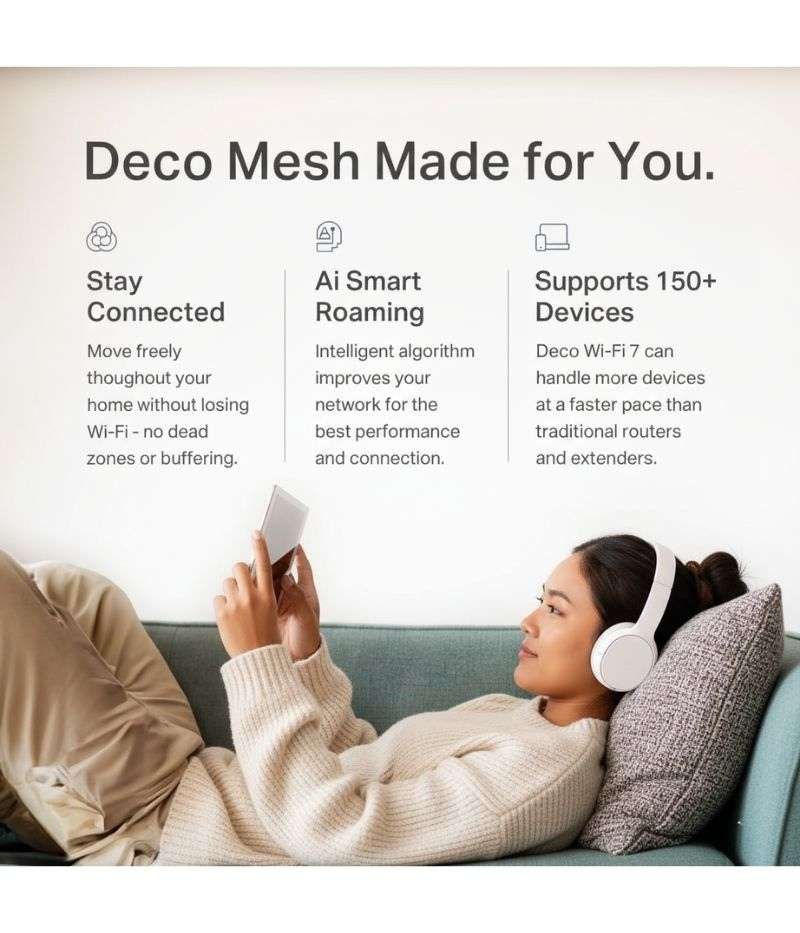 El Deco BE23 utiliza la avanzada tecnología Wi-Fi 7 (con MLO, Multi-RU y 4K-QAM) para ofrecer velocidades ultrarrápidas de hasta 3,6 Gbps combinadas (2,9 Gbps en 5 GHz y 688 Mbps en 2,4 GHz), optimizadas para los dispositivos más recientes.